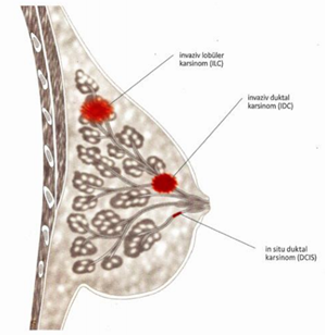IDC, süt kanalı duvarını geçerek meme dokusu içine uzanan kanser olarak tanımlanabilir. ILC, kanser hücreleri süt kanallarının çevresinde birikir ancak kanalların şekillerini bozmaz (Şekil 2). Mamografide tanımlanması bu açıdan oldukca zordur.
